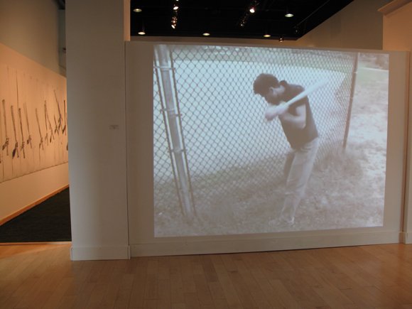 Two-room installation with ink on wax paper, bats, astroturf, piñata, platform, video projection, performance, dream collection station.
