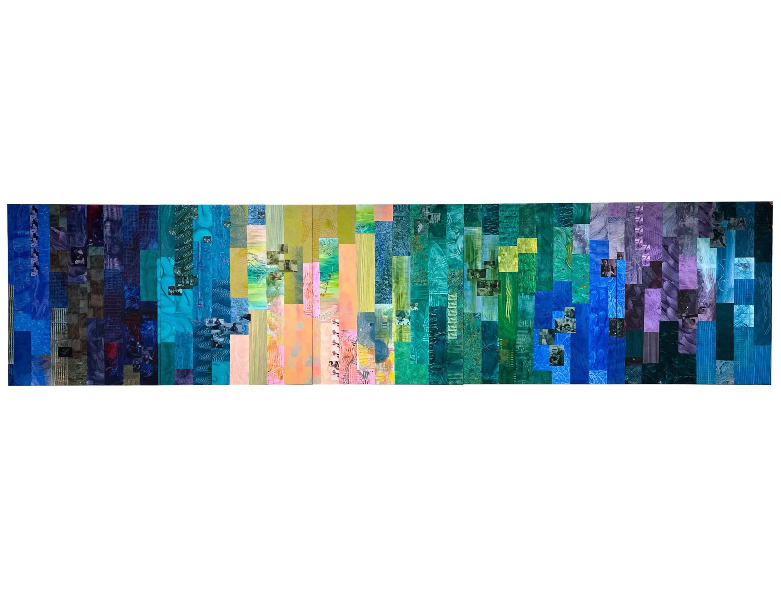 Gathering is a co-making, restorative project in the manner of a sewing bee, where people come together to meet, talk, and paint decorative paper, which is then combined into a site-specific work of art. The resulting permanent large-scale work was created in collaboration with over 50 women from the community of Greensboro, NC, who painted together, shared conversations about their visions of health, and contributed photographs of their experiences in health/care.